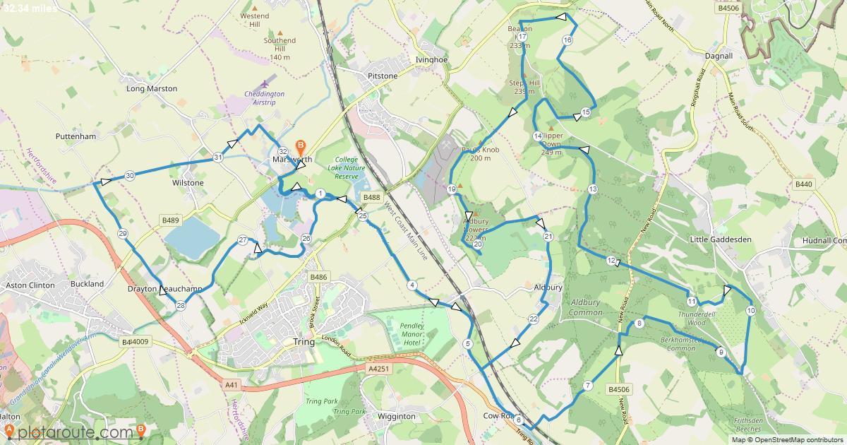 For those wondering, we haven’t made this an easy route either. The walk will include a variety of hills and steep inclines, taking us through places such as Ivinghoe Beacon, Pitstone Hill and Ashridge, to name just a few. We’ve mapped out the full route, which you can see below. To put the distance into perspective, if we walked in a straight line from our starting point in Marsworth, we’d end up roughly in Central London.